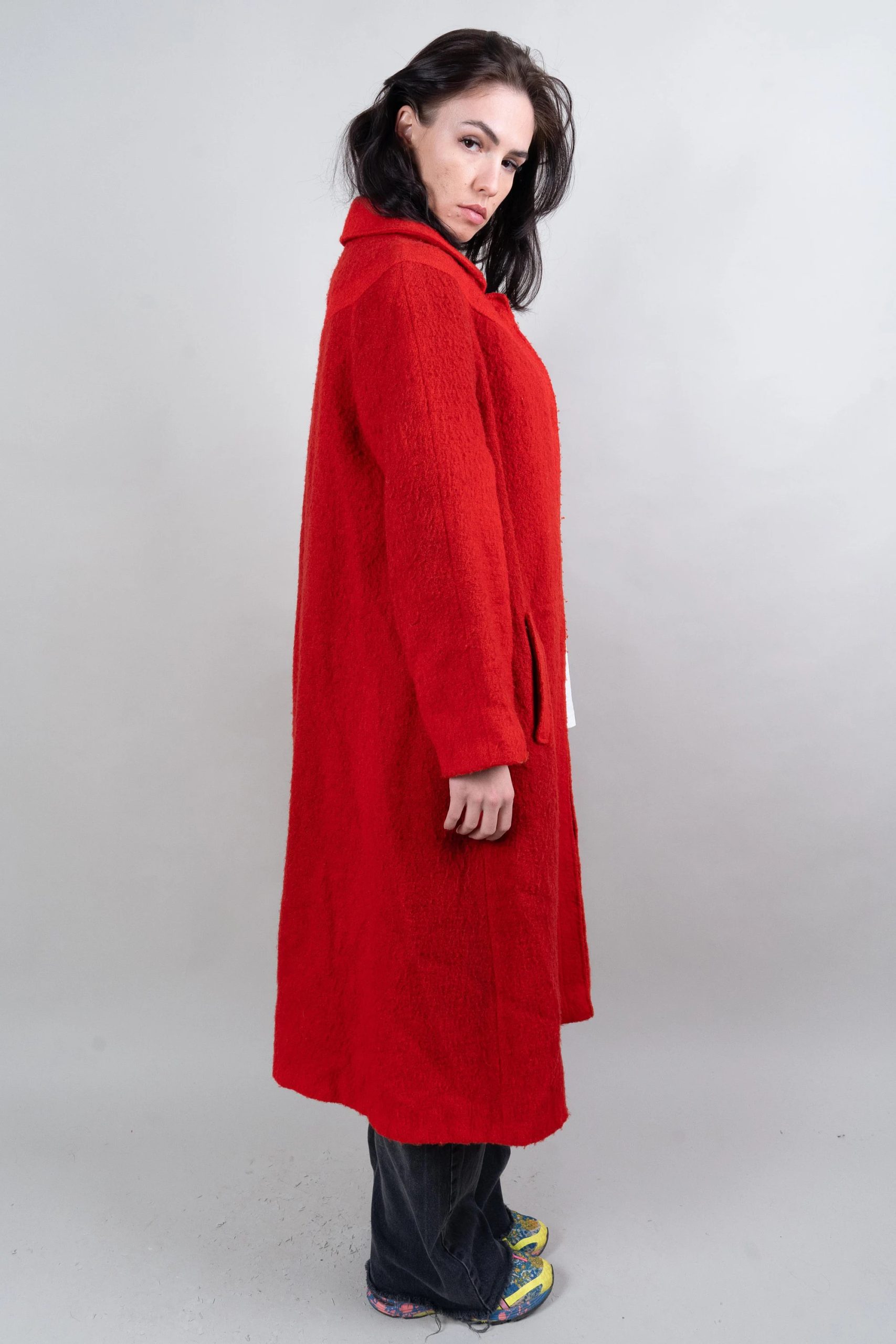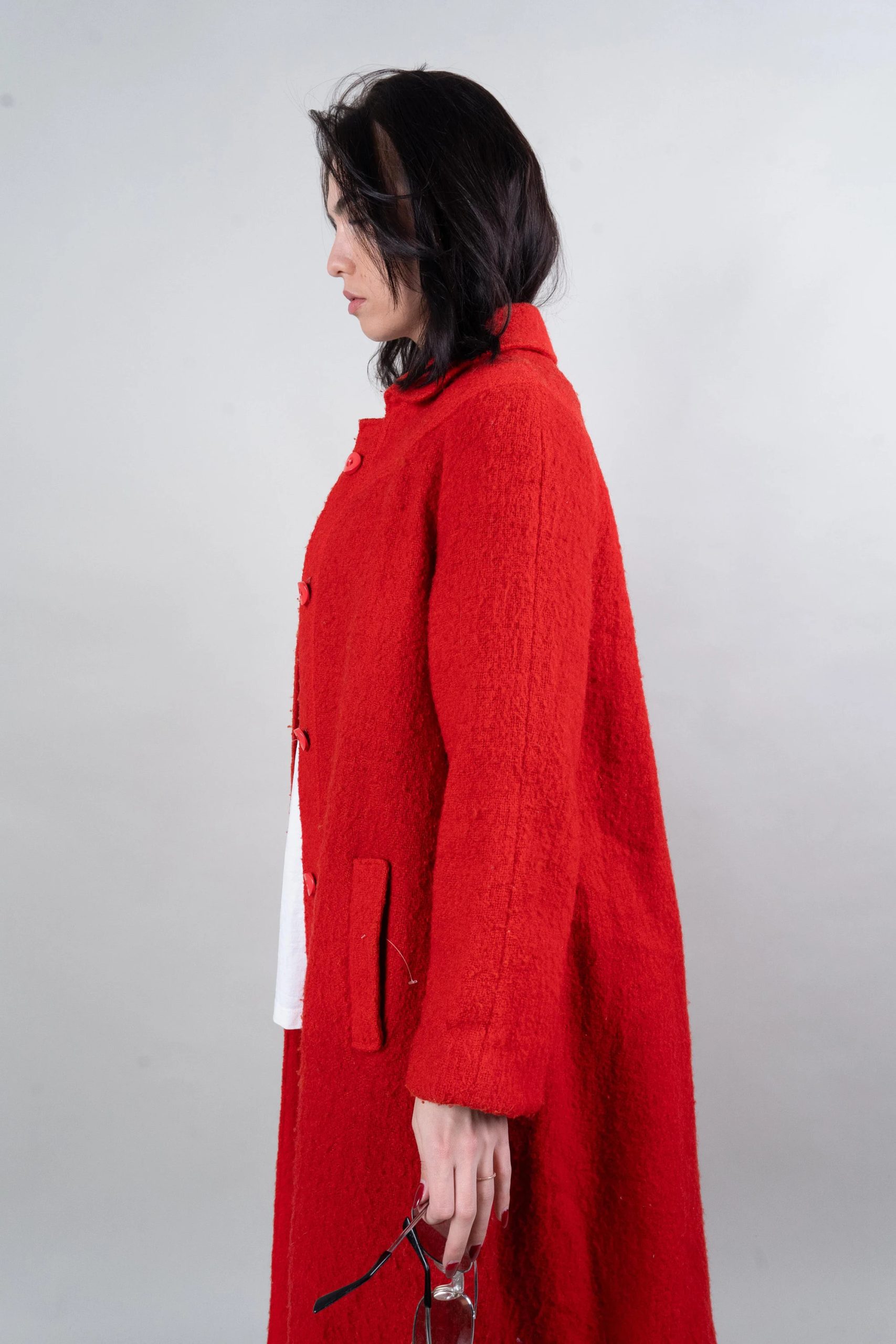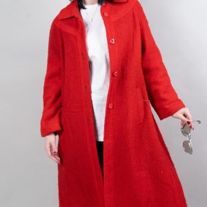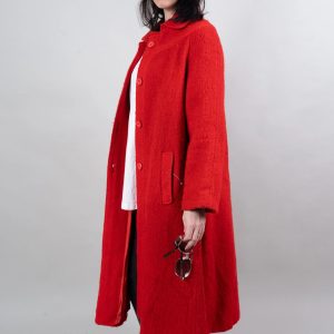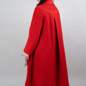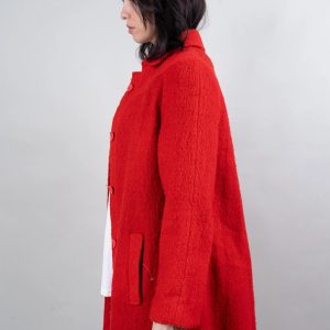 This vibrant red coat is eye-catching and uplifting. Made from a soft, comfortable tweed fabric with a slightly grainy texture, its single-breasted design and simple lapel exude sophistication and elegance. The relaxed shoulders and soft A-line silhouette, ending at the calves, allow for effortless style when paired with t-shirts, cardigans, or dresses. Concealed side pockets keep your hands warm and provide convenient storage for small items, while the lightweight yet warm fabric ensures comfort on cooler days. This bold and versatile coat is ideal for urban commutes, gallery visits, and festive evenings.