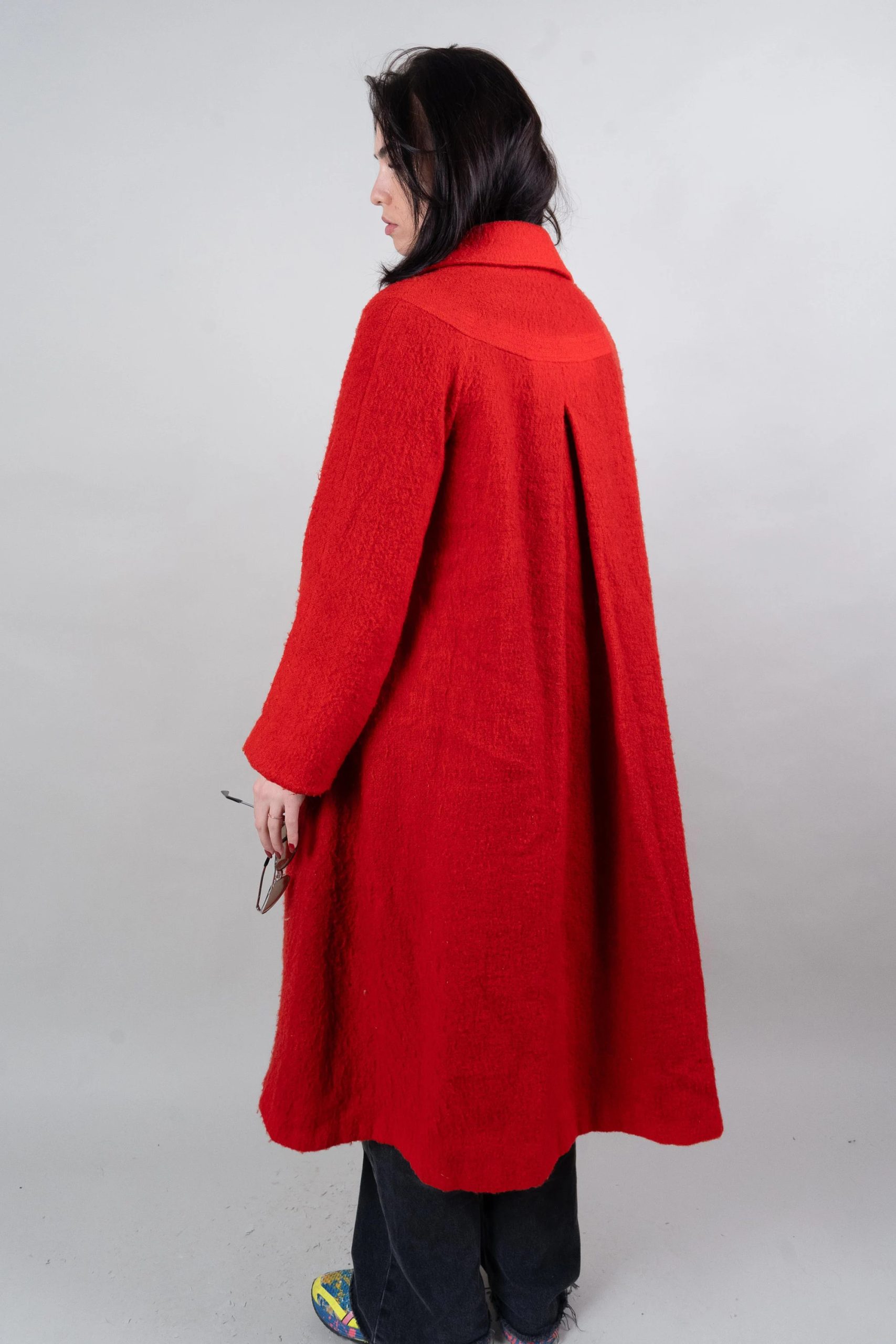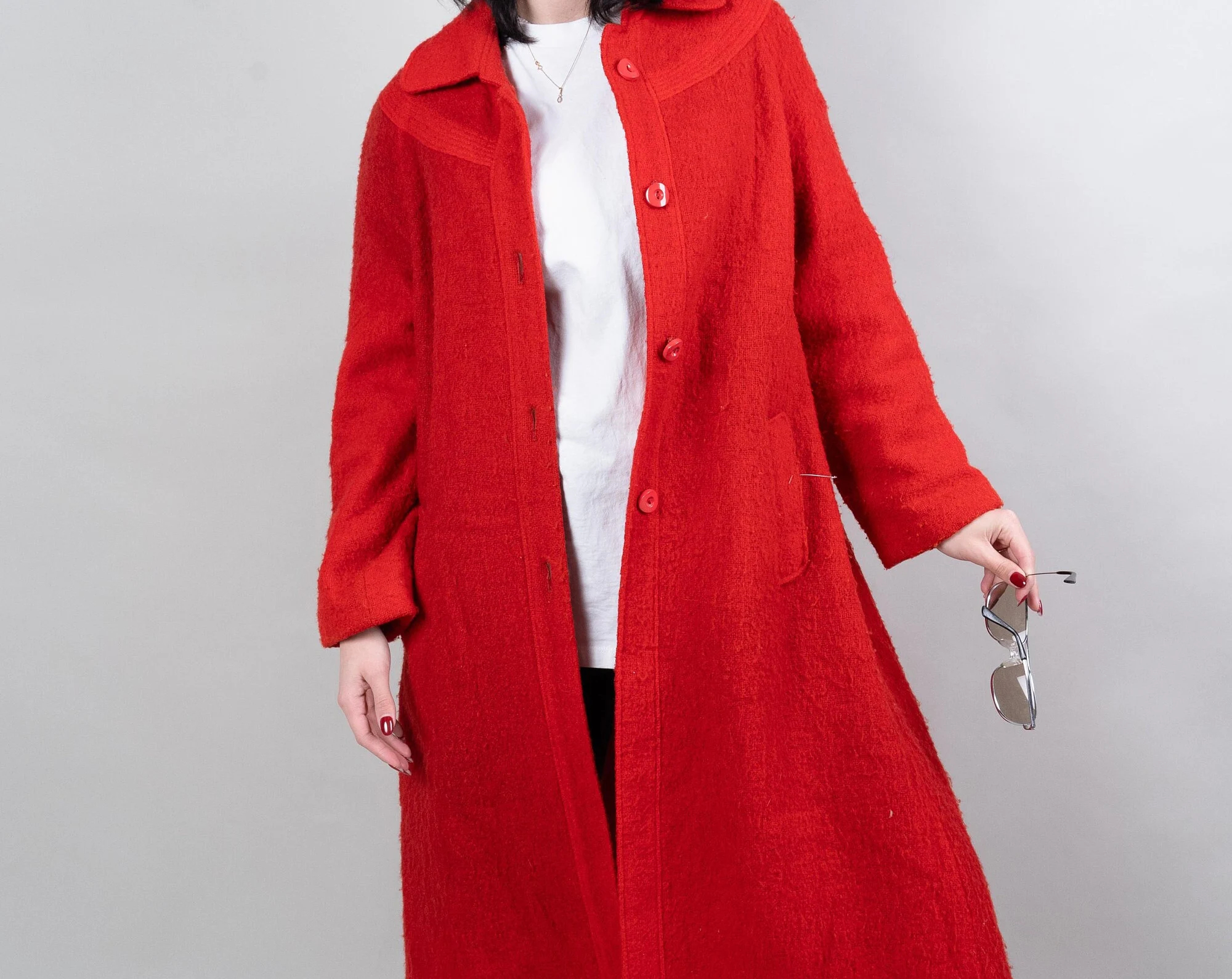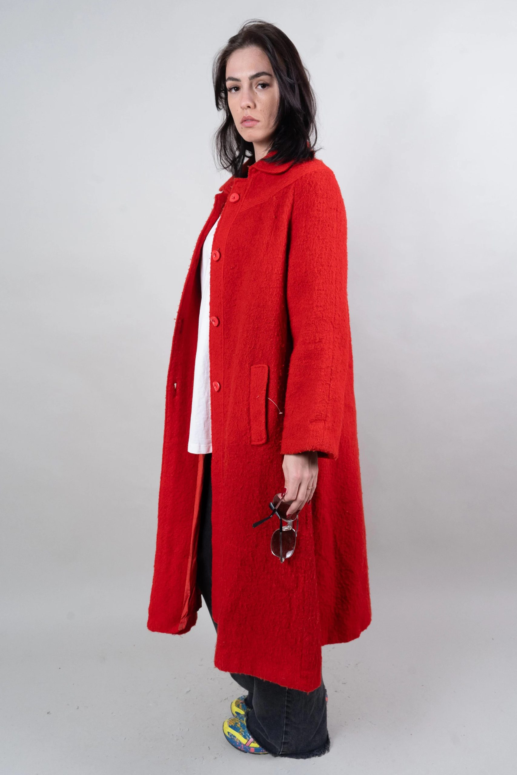 This vibrant red coat is eye-catching and uplifting. Made from a soft, comfortable tweed fabric with a slightly grainy texture, its single-breasted design and simple lapel exude sophistication and elegance. The relaxed shoulders and soft A-line silhouette, ending at the calves, allow for effortless style when paired with t-shirts, cardigans, or dresses. Concealed side pockets keep your hands warm and provide convenient storage for small items, while the lightweight yet warm fabric ensures comfort on cooler days. This bold and versatile coat is ideal for urban commutes, gallery visits, and festive evenings.