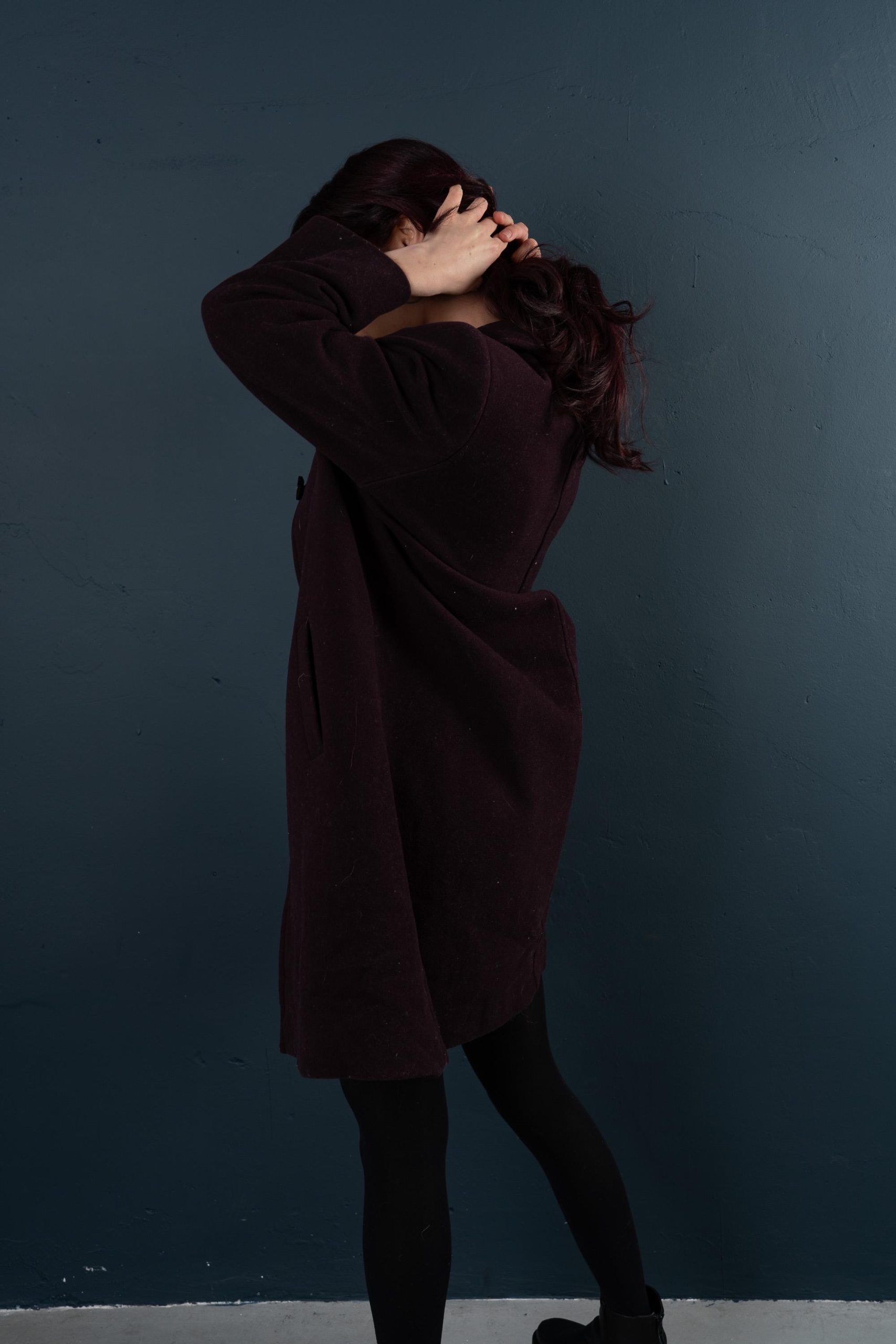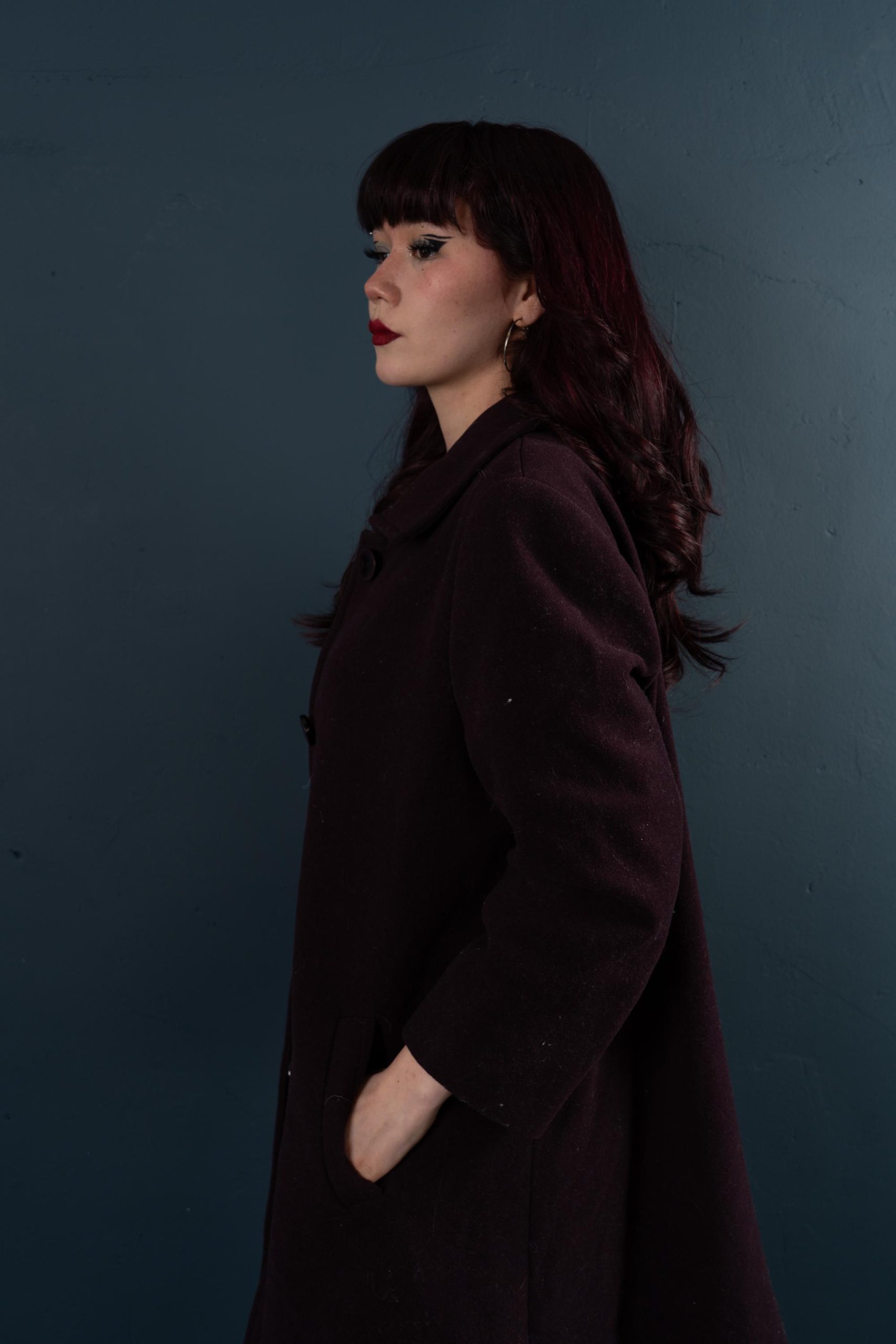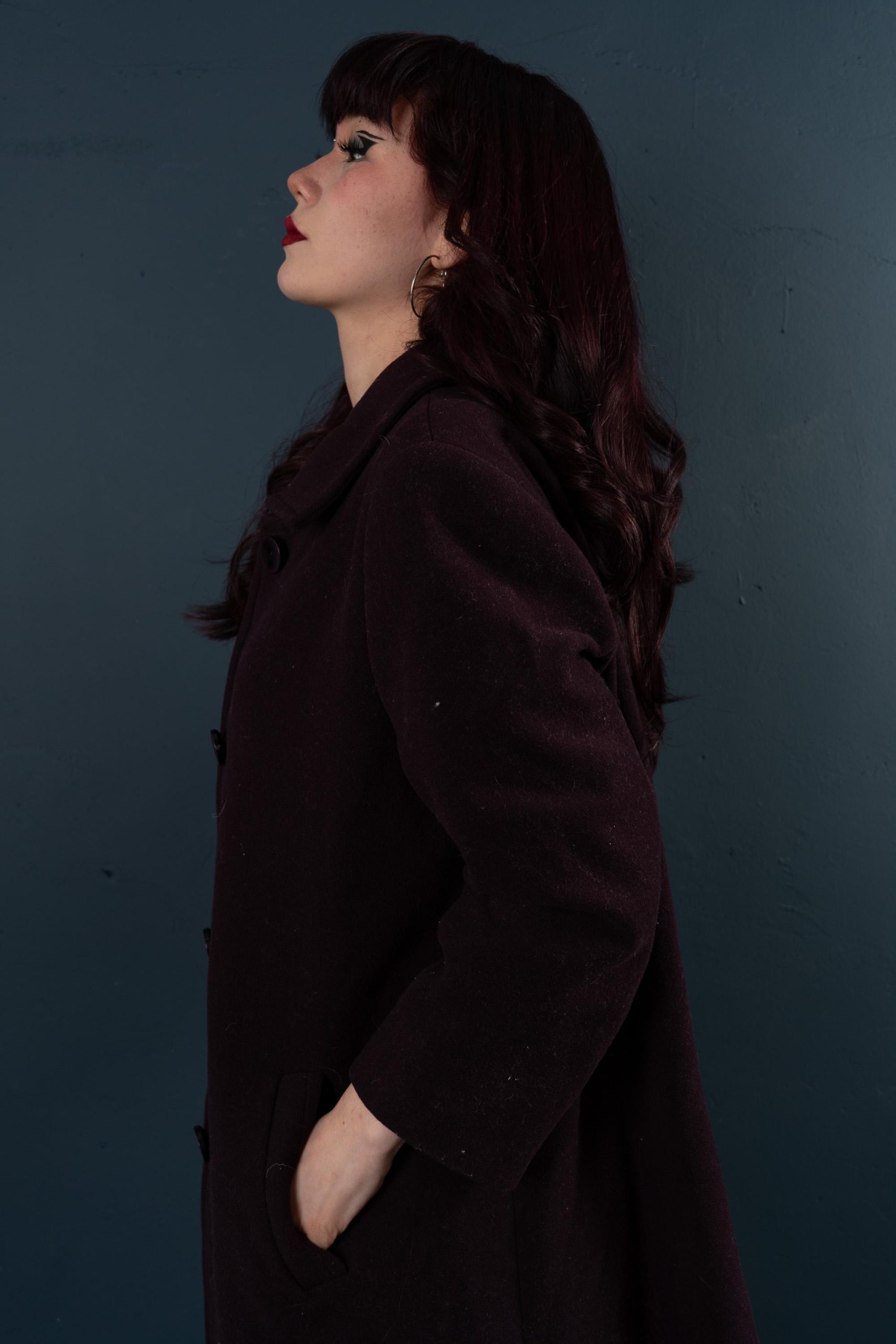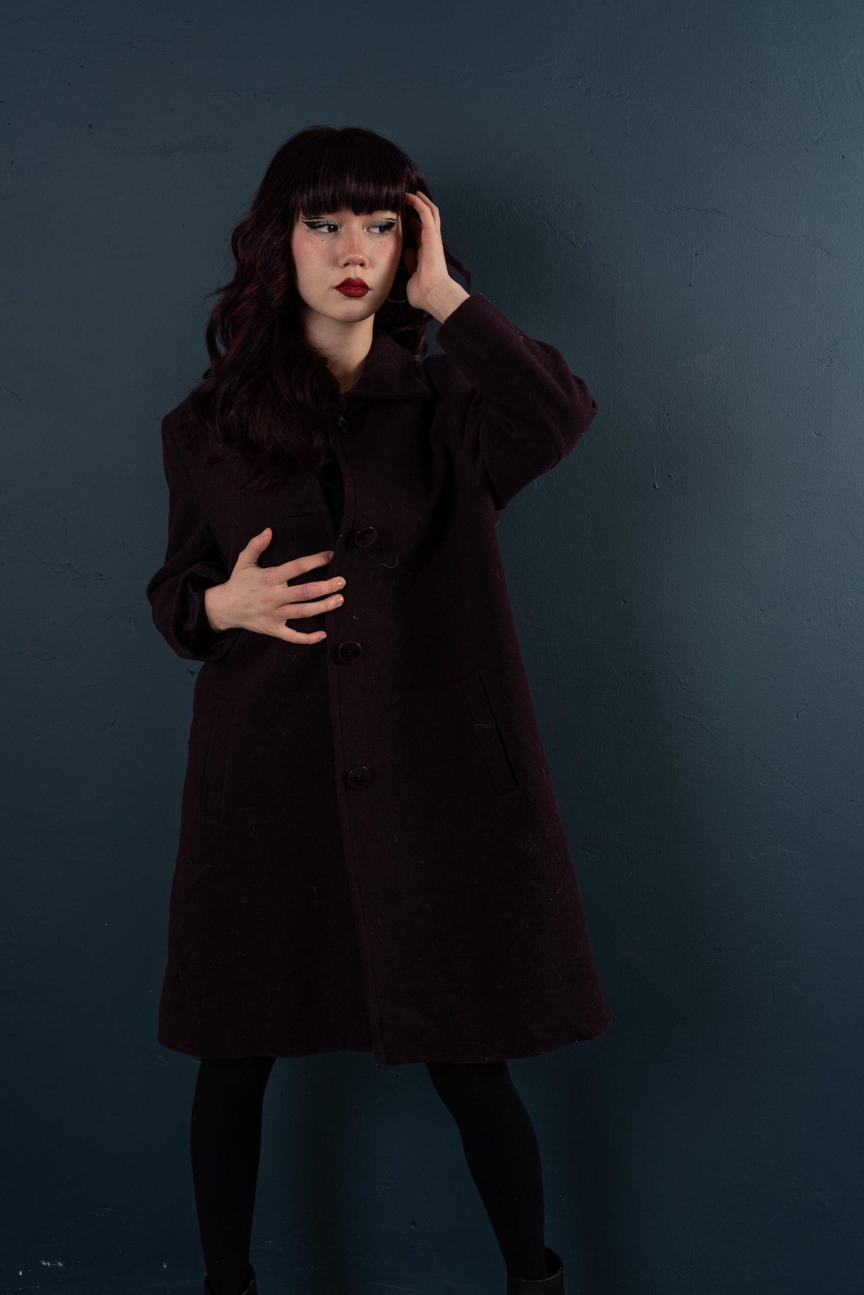 This understated yet elegant coat boasts a rich, deep plum hue. The single-breasted design and simple lapel enhance its sophistication, while the relaxed shoulders and soft A-line silhouette create a modern yet flattering shape. The knee-length cut pairs easily with cardigans or dresses, and features concealed side pockets for convenient storage of everyday essentials. Simple details and tonal buttons make it ideal for a variety of occasions, from work and evening events to weekend relaxation.