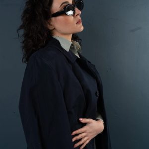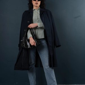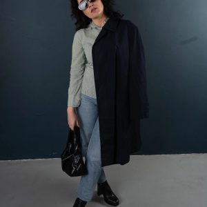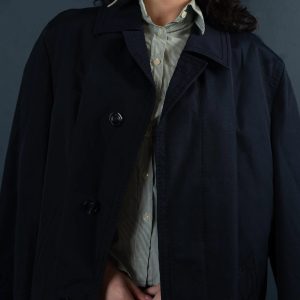 This stylish urban trench coat features a deep navy blue cut for easy layering. The single-breasted design and clean lapel exude a sharp, sophisticated look; raglan sleeves offer comfortable movement and a relaxed drape, easily paired with shirts, cardigans, or blazers. A concealed windproof flap and knee-length hem provide effective protection from the cold without adding bulk; a center back vent allows for freedom of movement. Concealed patch pockets keep your hands warm and provide convenient storage for everyday essentials. Simple hardware and clean lines make it ideal for commuting, evening events, and weekend relaxation.