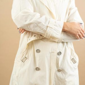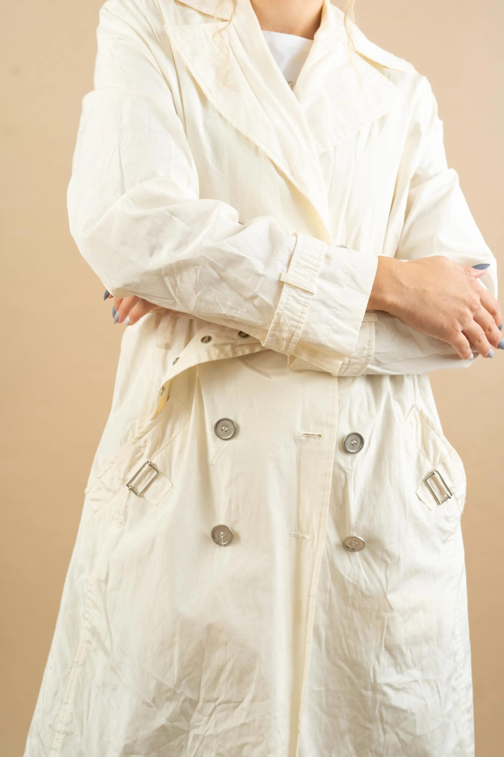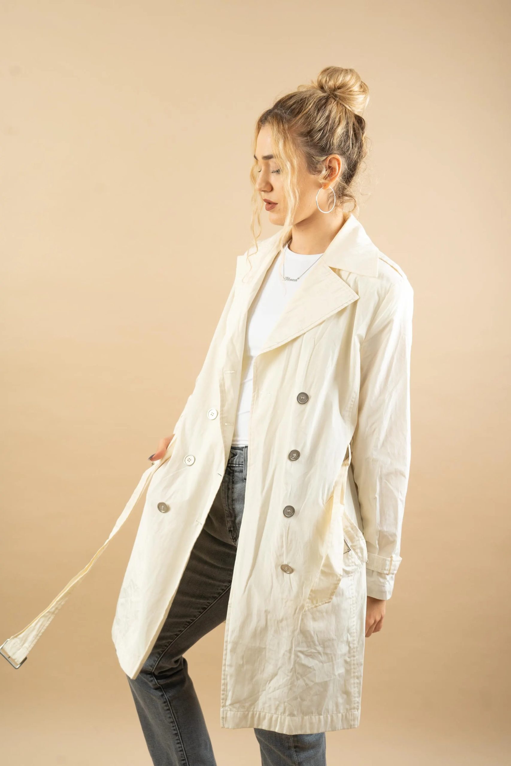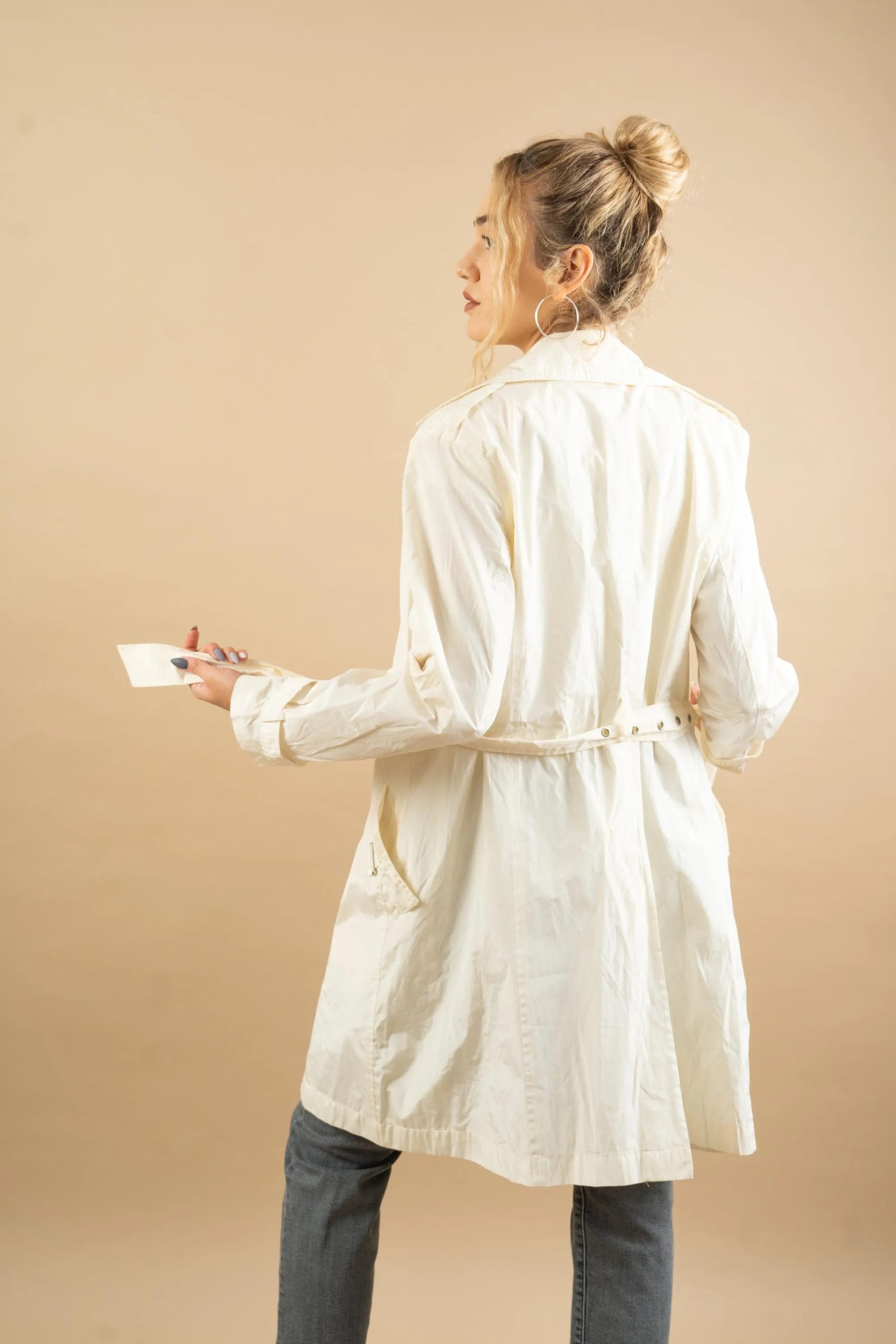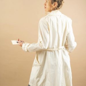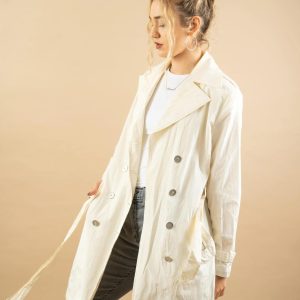 This elegant trench coat features a refreshing ivory white color, a double-breasted design, and a clean peak lapel, exuding sophisticated style. The belt with metal eyelets allows for a cinched waist, while the knee-length provides both elegant coverage and freedom of movement. Subtle windproof details and the smooth, slightly crisp fabric make it a versatile piece for commuting or a perfect choice for weekend casual wear. Slanted hand pockets provide convenient storage for essentials; the fine interior workmanship allows for easy pairing with T-shirts, knitwear, or creating a polished professional look.