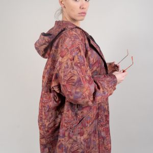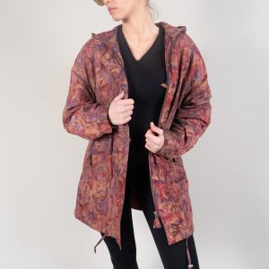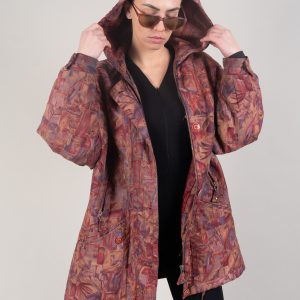This parka exudes a vintage tapestry vibe and is highly individualistic. The fabric features a rich burgundy paisley print, accented with rust and plum hues, and includes a practical hood and a convenient zipper hidden beneath the snap-buttoned windproof placket. The relaxed, mid-length cut allows for easy layering over knitwear or t-shirts, while adjustable drawstrings at the waist and hem allow for a fitted silhouette or a relaxed, effortless style. Slanted hand pockets provide convenient storage for essentials. Eye-catching yet casual—ideal for music festivals, city strolls, or weekend coffee outings.