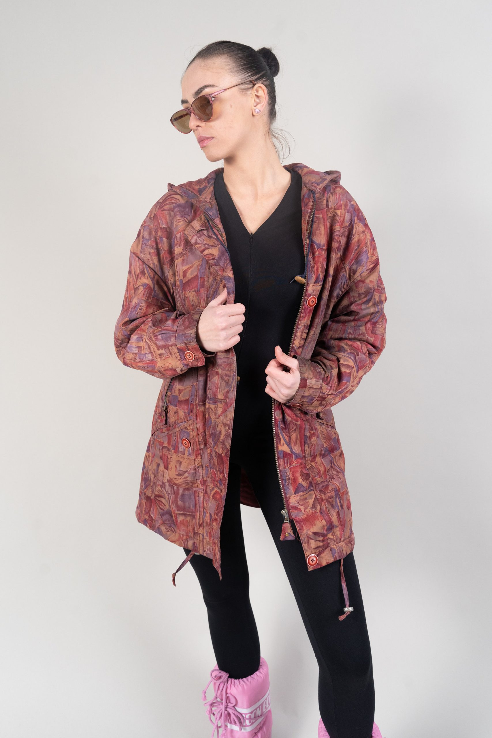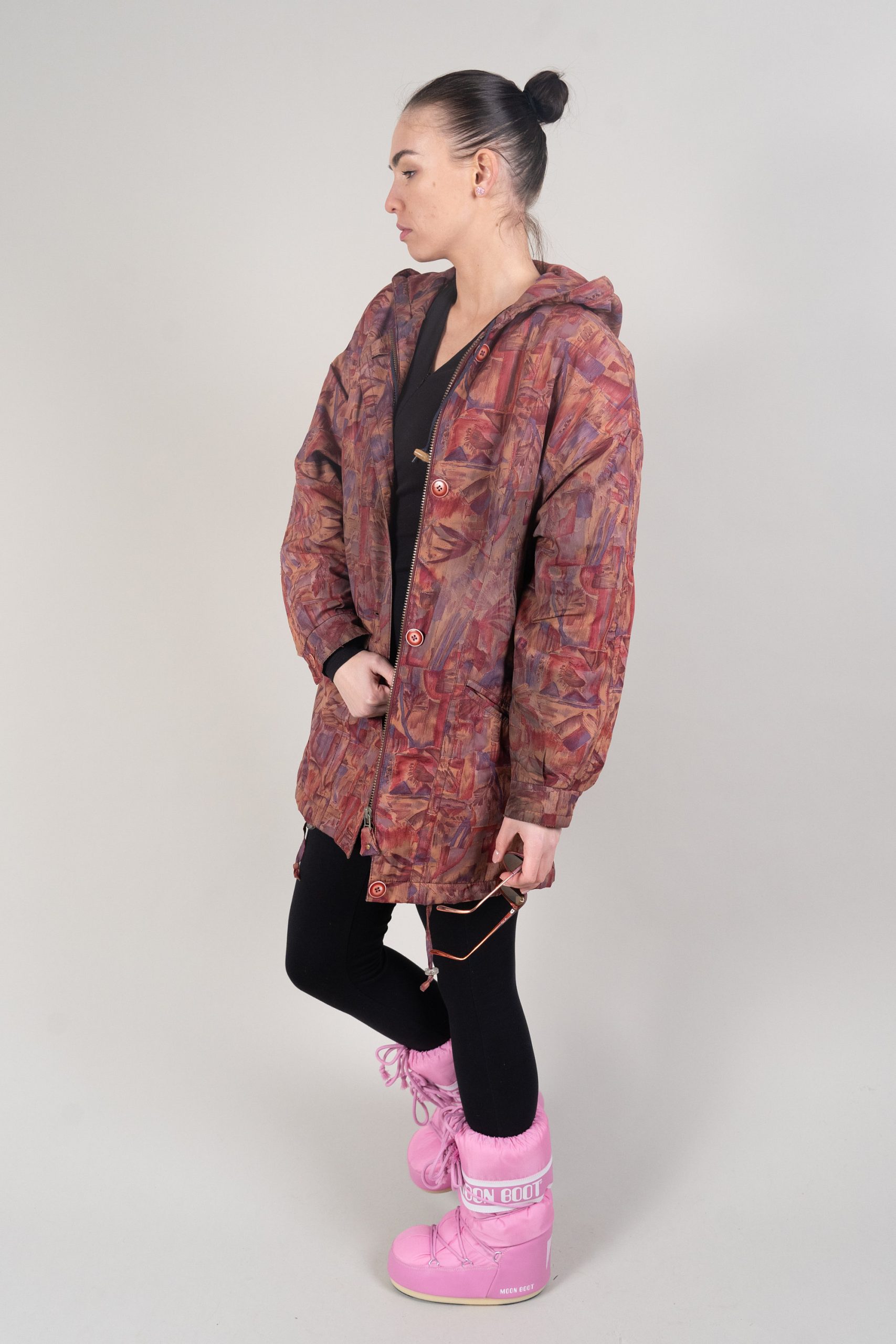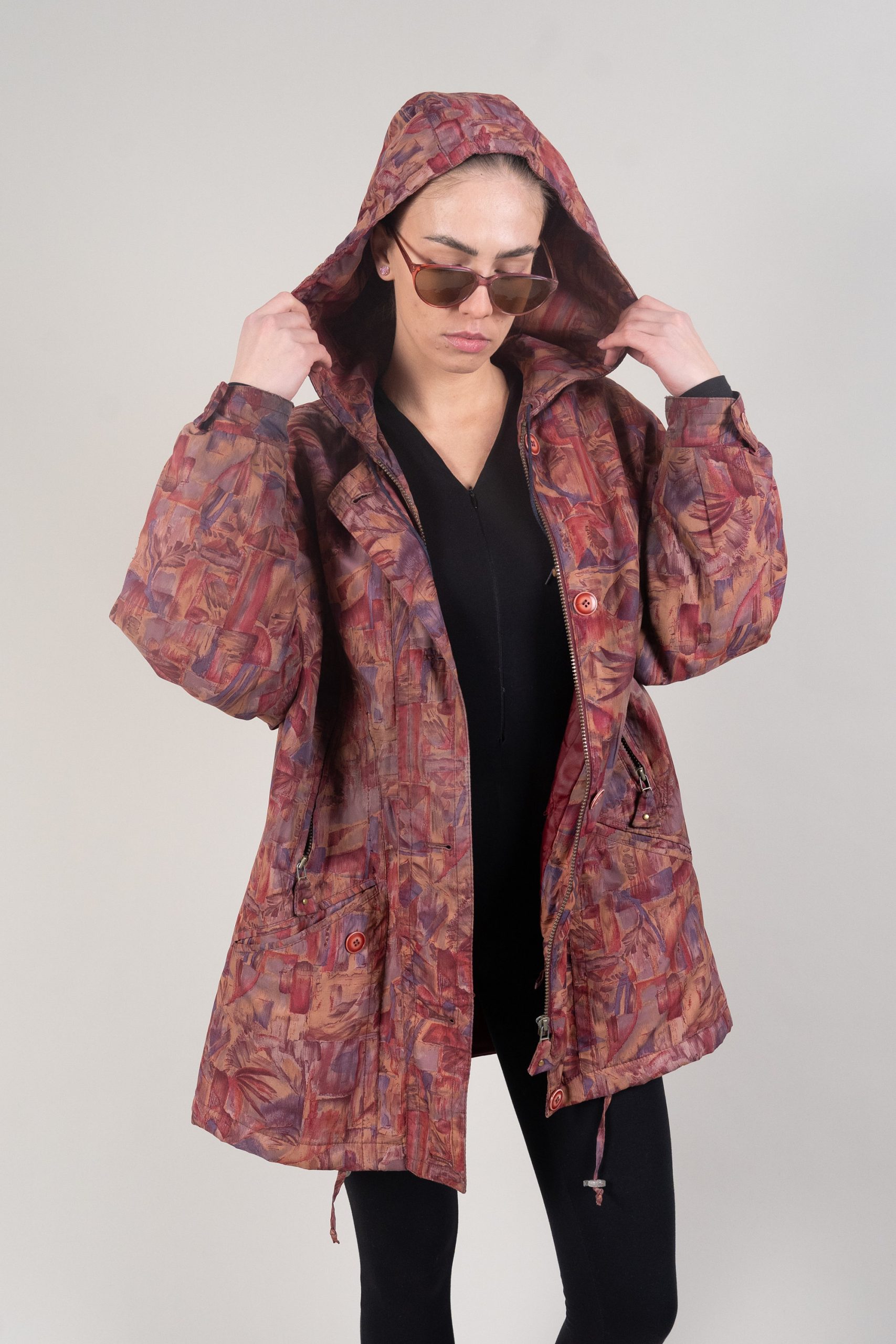 This parka exudes a vintage tapestry vibe and is highly individualistic. The fabric features a rich burgundy paisley print, accented with rust and plum hues, and includes a practical hood and a convenient zipper hidden beneath the snap-buttoned windproof placket. The relaxed, mid-length cut allows for easy layering over knitwear or t-shirts, while adjustable drawstrings at the waist and hem allow for a fitted silhouette or a relaxed, effortless style. Slanted hand pockets provide convenient storage for essentials. Eye-catching yet casual—ideal for music festivals, city strolls, or weekend coffee outings.