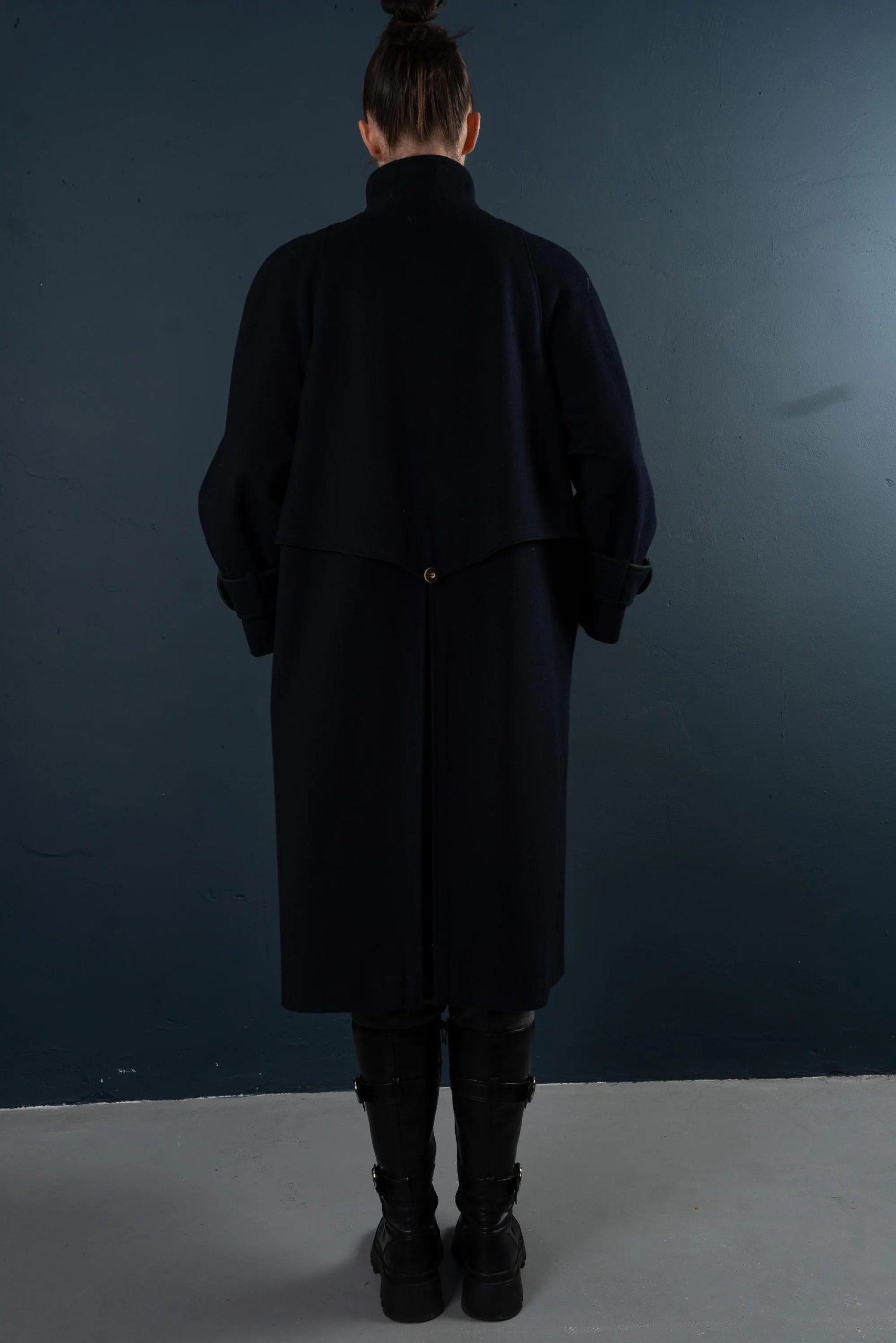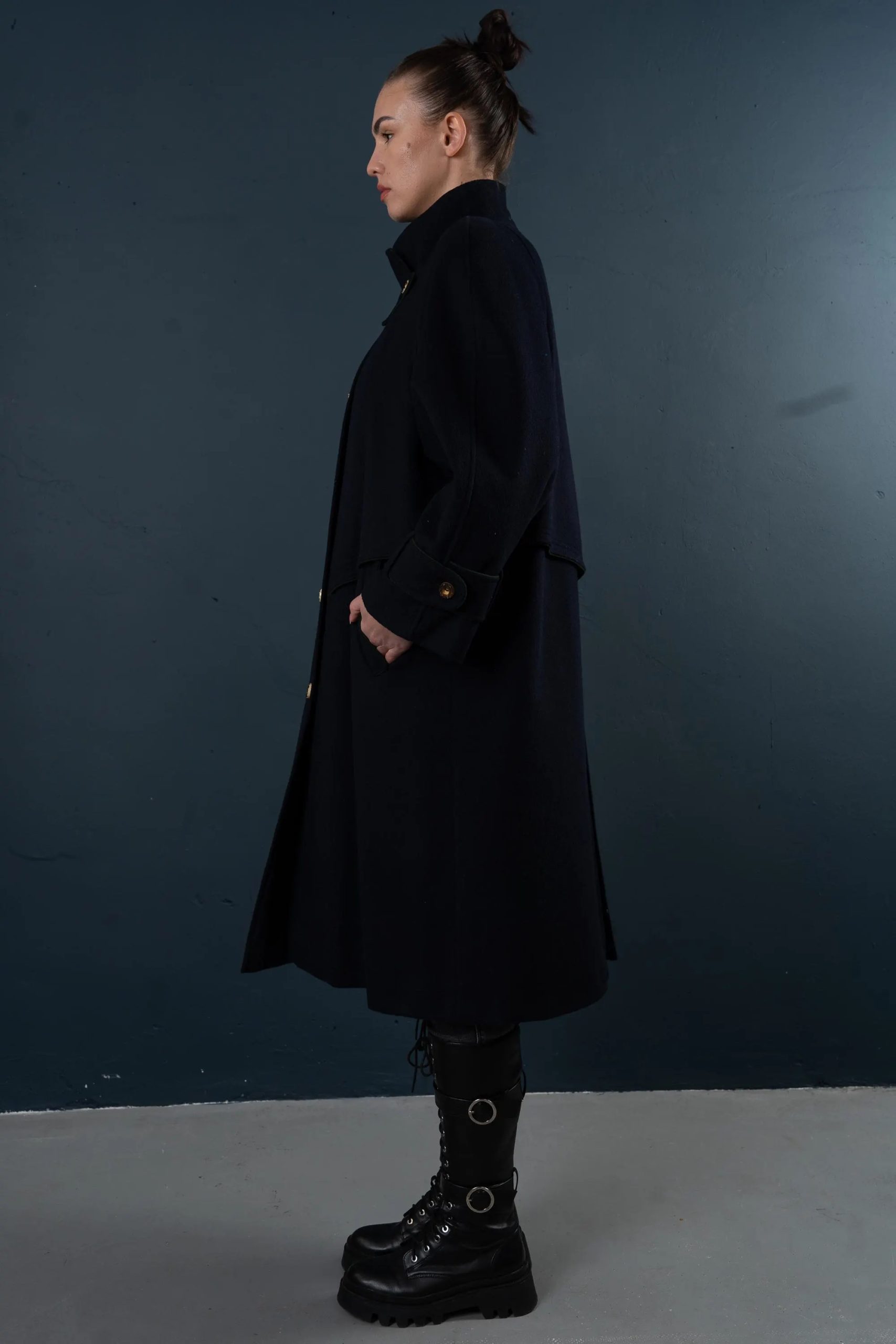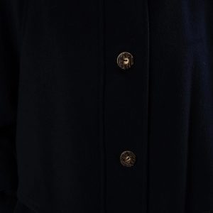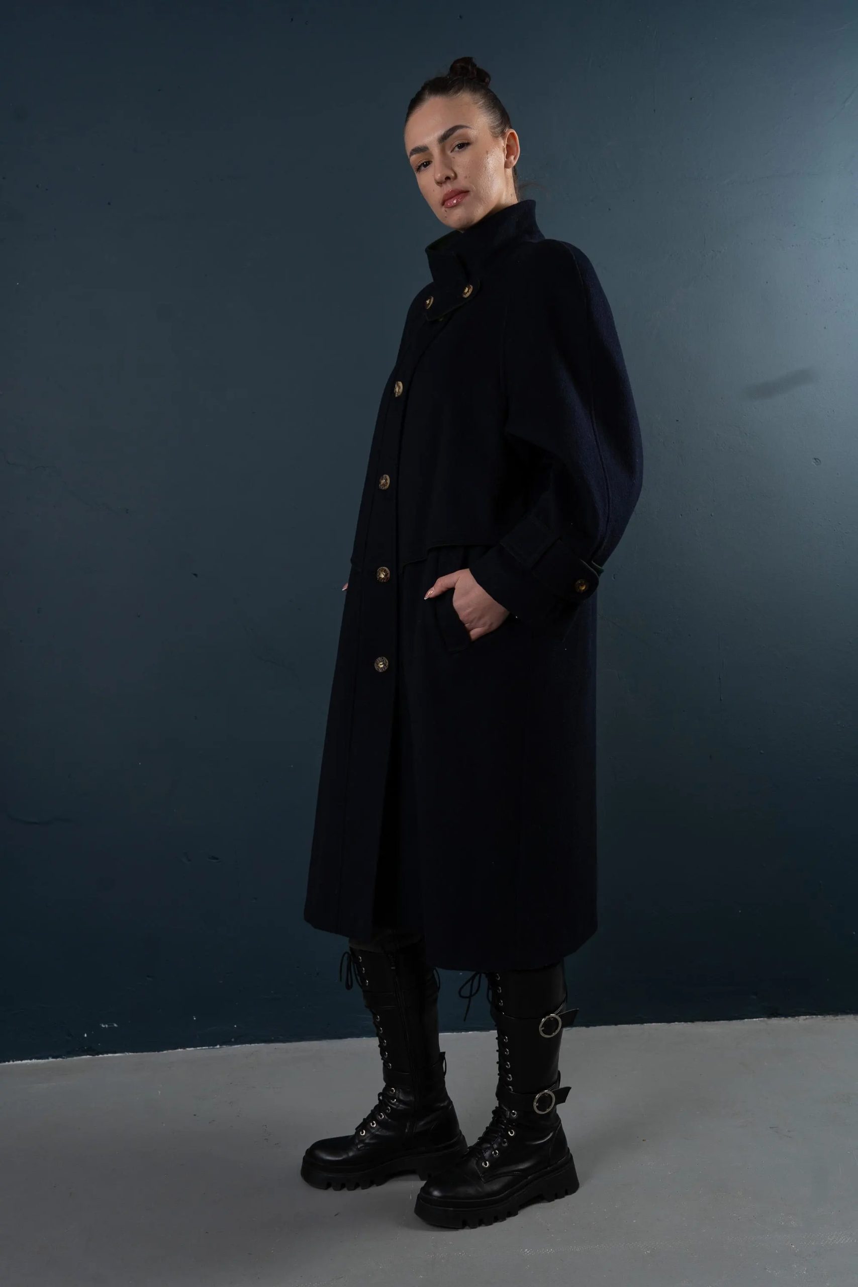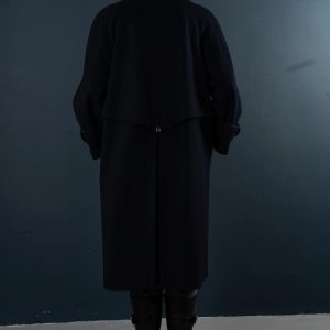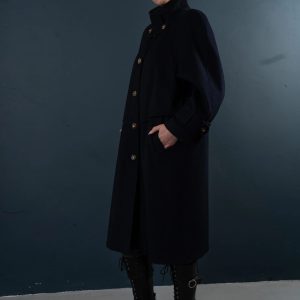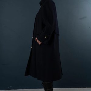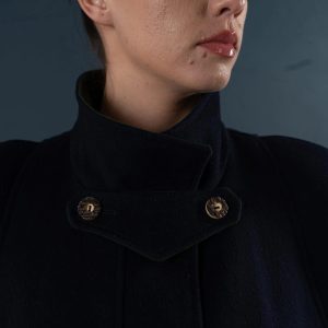 This deep navy blue coat exudes both dignity and sophistication, perfectly embodying classic military tailoring. The high stand-up collar with double buckles effectively locks in warmth and flatters the face shape; the cape-style shoulder yoke adds layering while providing effective wind protection without appearing bulky. The straight, knee-length silhouette allows for easy layering with knitwear or blazers; the simple button-down front and neat stitching maintain a clean line. Polished metal buttons and adjustable sleeve tabs give the coat a crisp texture and durability. Concealed side pockets keep hands warm and provide storage for everyday essentials—making it suitable for both city commutes and evening activities.