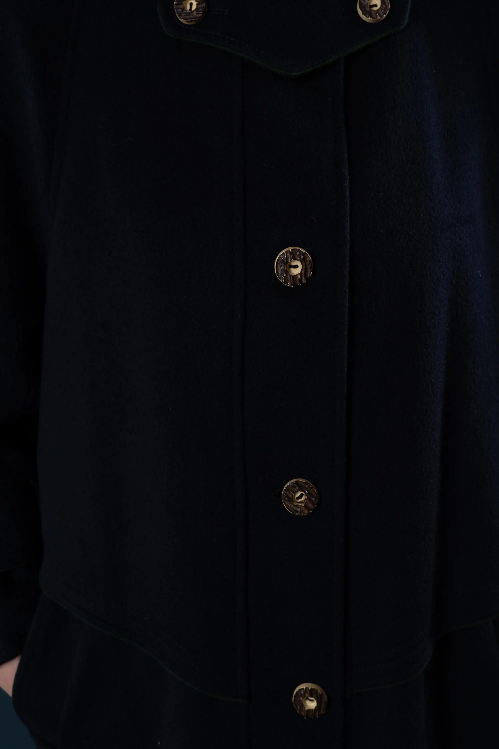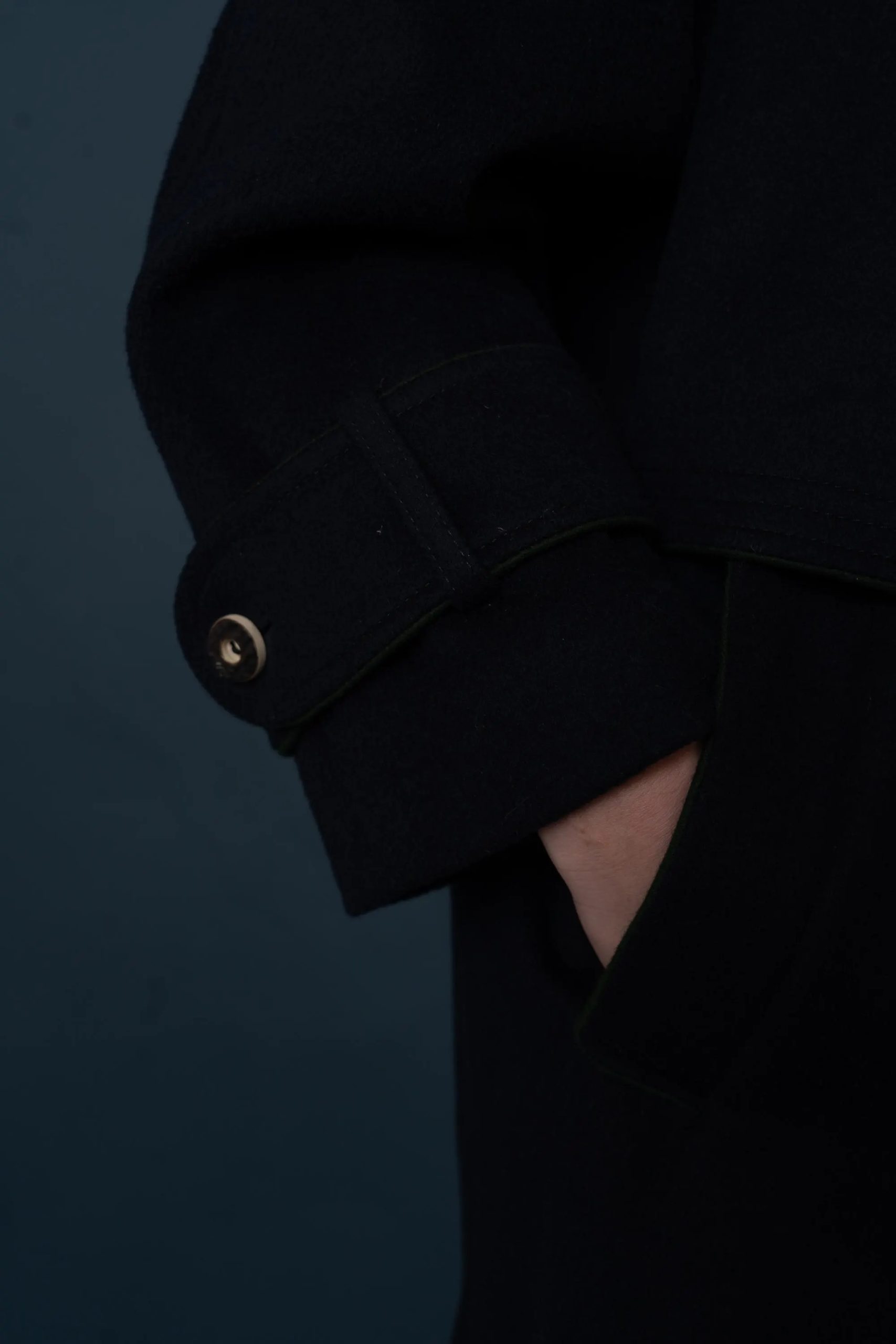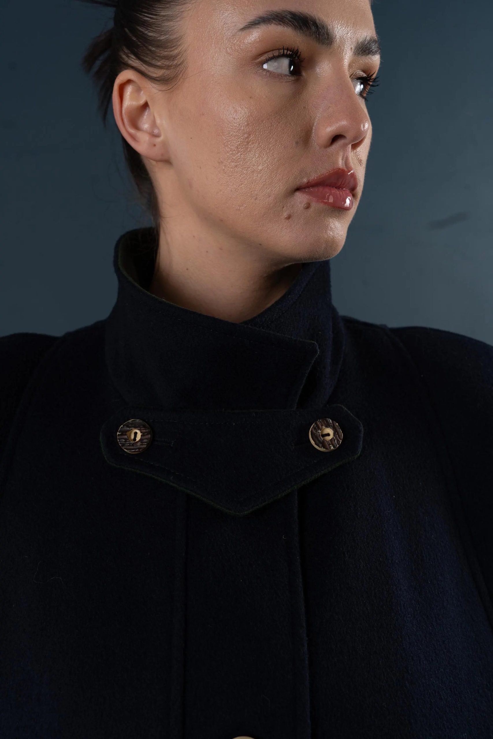 This deep navy blue coat exudes both dignity and sophistication, perfectly embodying classic military tailoring. The high stand-up collar with double buckles effectively locks in warmth and flatters the face shape; the cape-style shoulder yoke adds layering while providing effective wind protection without appearing bulky. The straight, knee-length silhouette allows for easy layering with knitwear or blazers; the simple button-down front and neat stitching maintain a clean line. Polished metal buttons and adjustable sleeve tabs give the coat a crisp texture and durability. Concealed side pockets keep hands warm and provide storage for everyday essentials—making it suitable for both city commutes and evening activities.