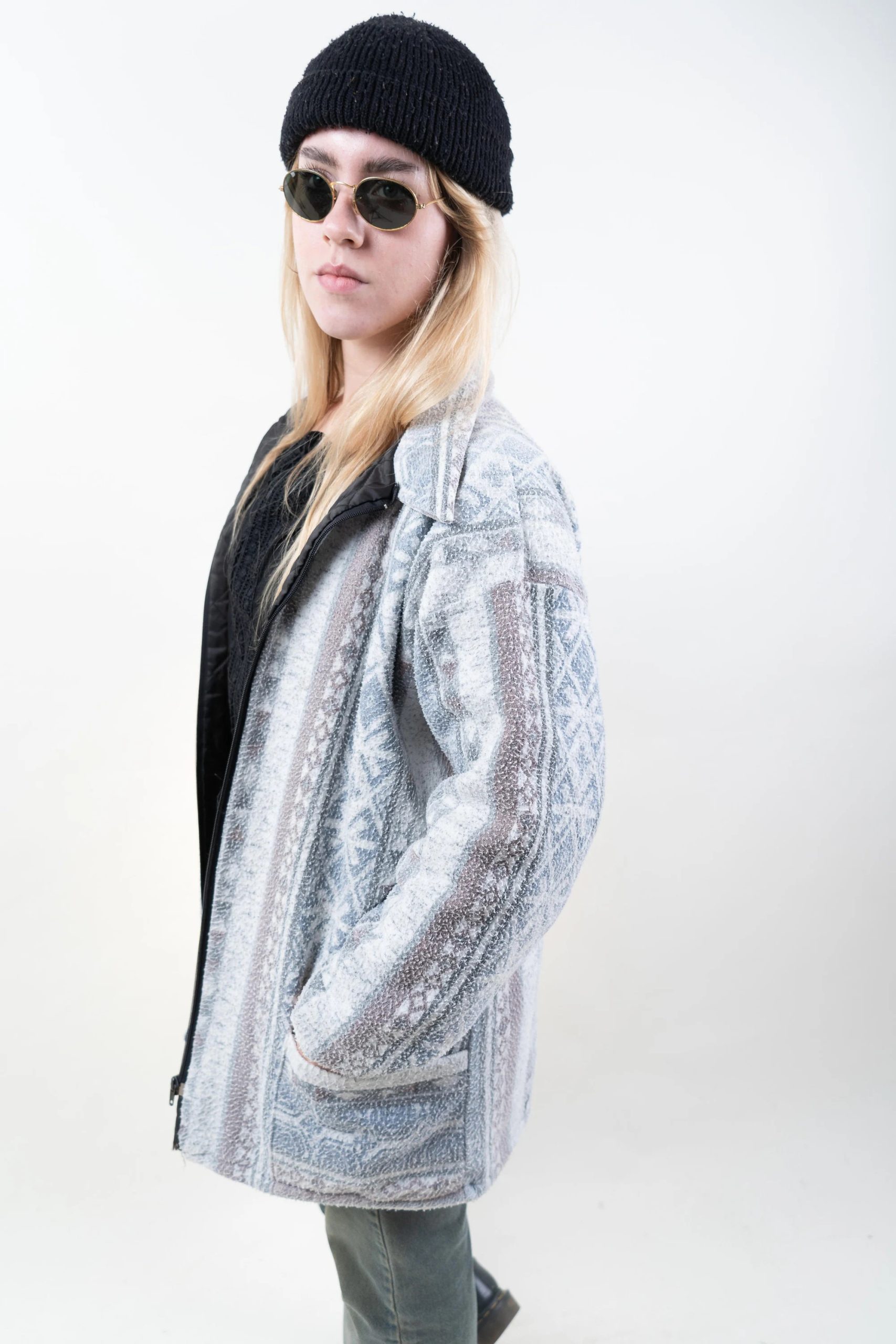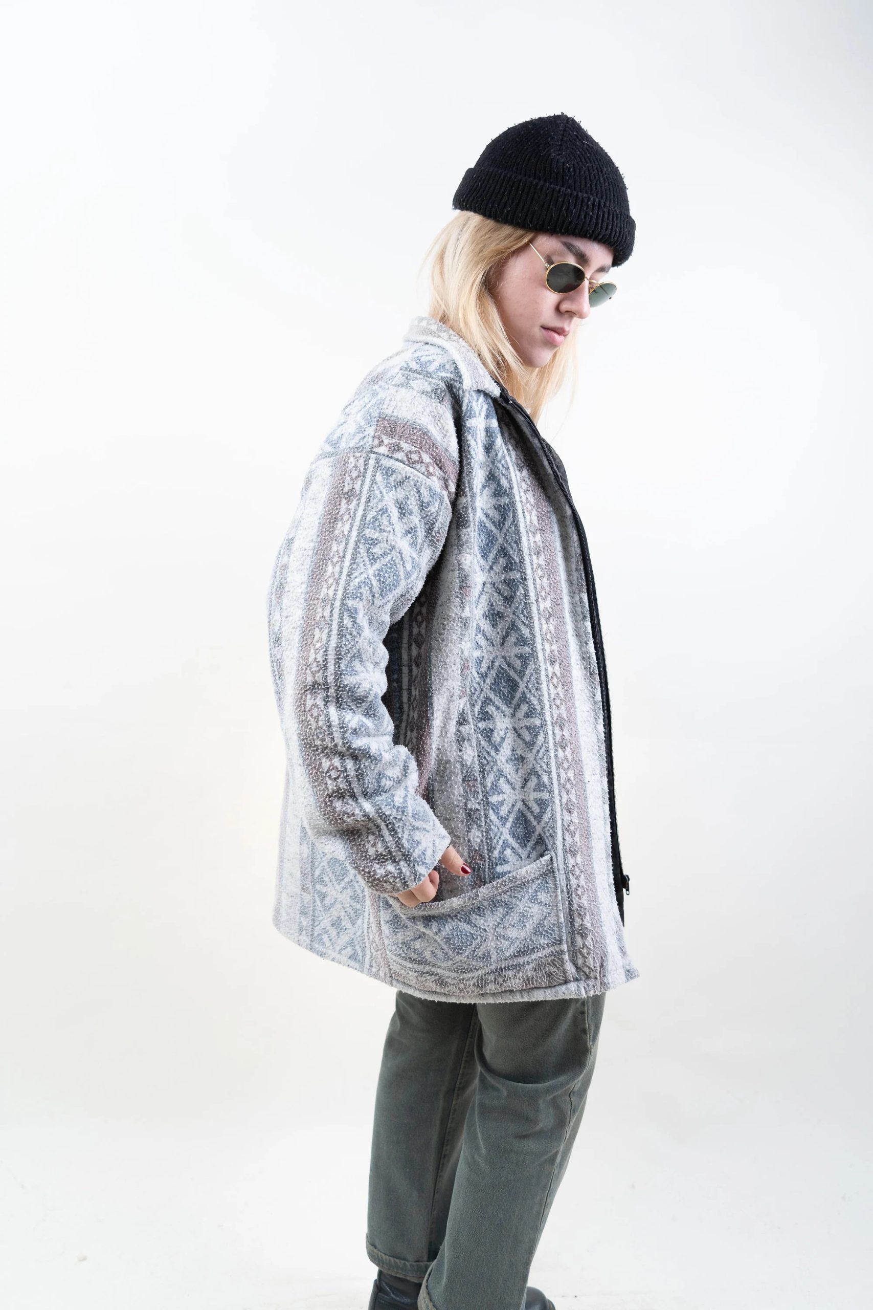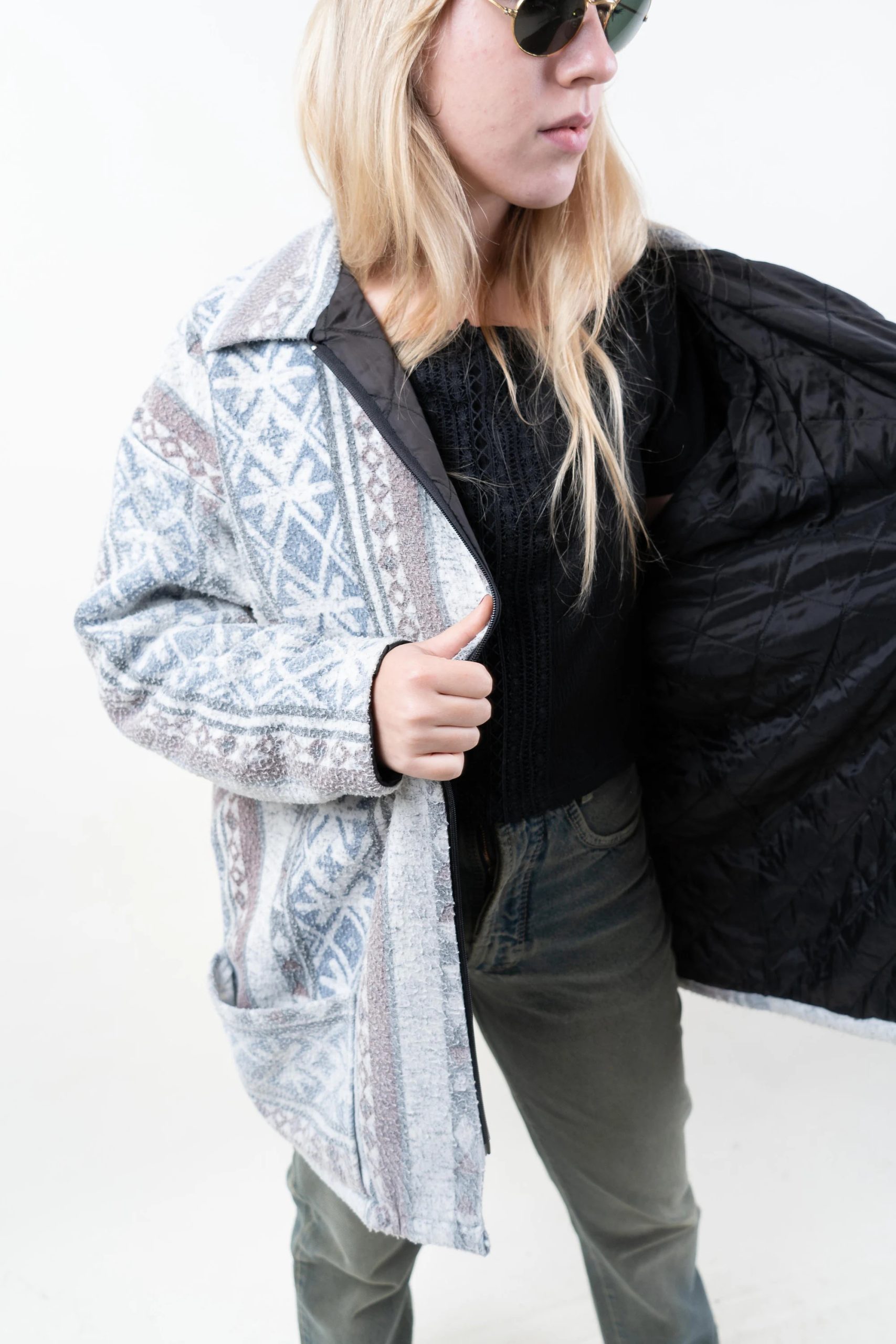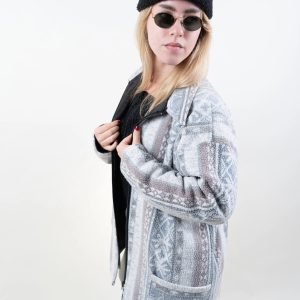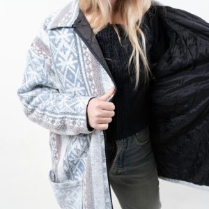 This comfortable jacket features a soft grey hue with a Nordic/Fair Isle pattern, a classic lapel, and a convenient zip-up front, providing warmth and comfort with a touch of alpine flair. The soft fleece lining offers warmth without bulk, making it ideal for chilly mornings, dropping off or picking up kids from school, or weekend shopping trips. Side hand pockets keep your hands warm, while a patch pocket at the bottom provides convenient storage for small items. The relaxed, hip-length cut allows for easy layering with t-shirts, cardigans, or hoodies for a relaxed winter look.