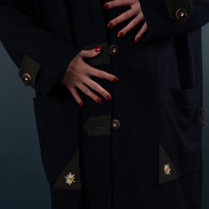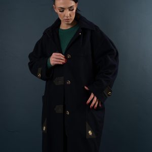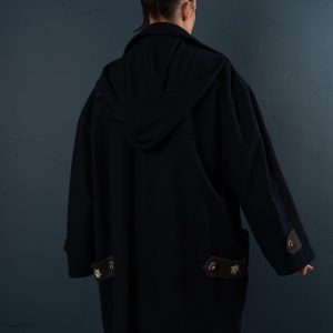 This practical coat combines style with understated military flair. The relaxed fit in deep navy blue, reaching to the knees, features a protective hood and a simple button-down placket. Large patch pockets enhance the overall structure, while contrasting reinforced edges and metallic details add durability and a unique texture. Adjustable cuff straps help protect against wind and flatter the sleeves, while the smooth lining allows for layering with sweaters or blazers. Combining practicality and style, it’s ideal for commuting in cold weather, weekend walks, and evening outings.