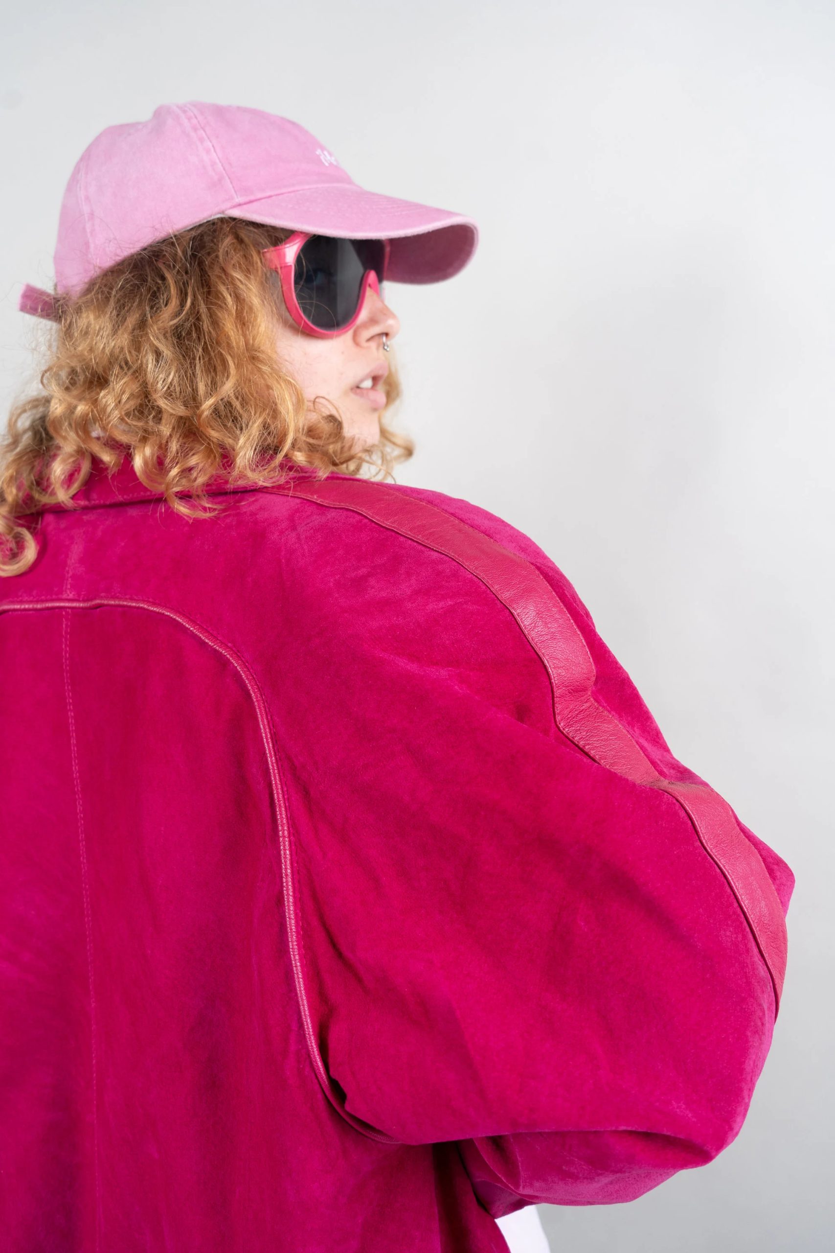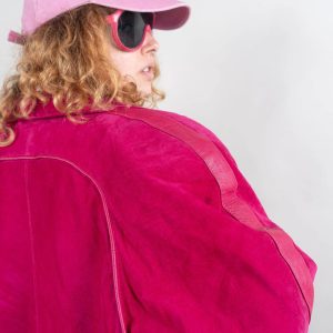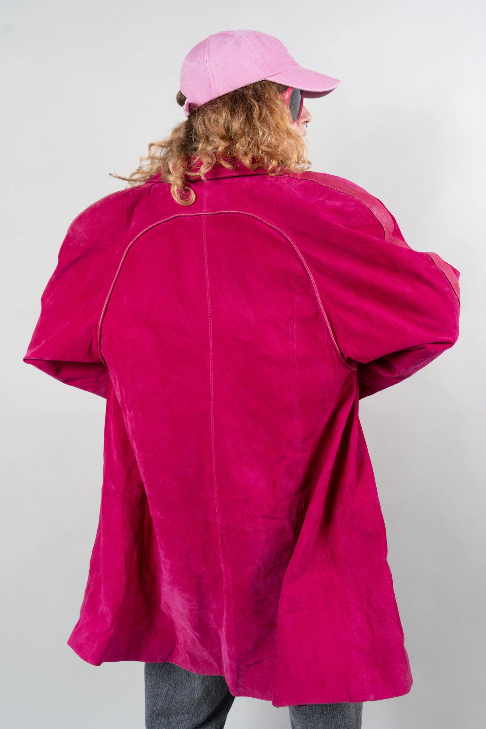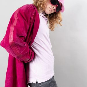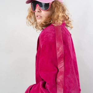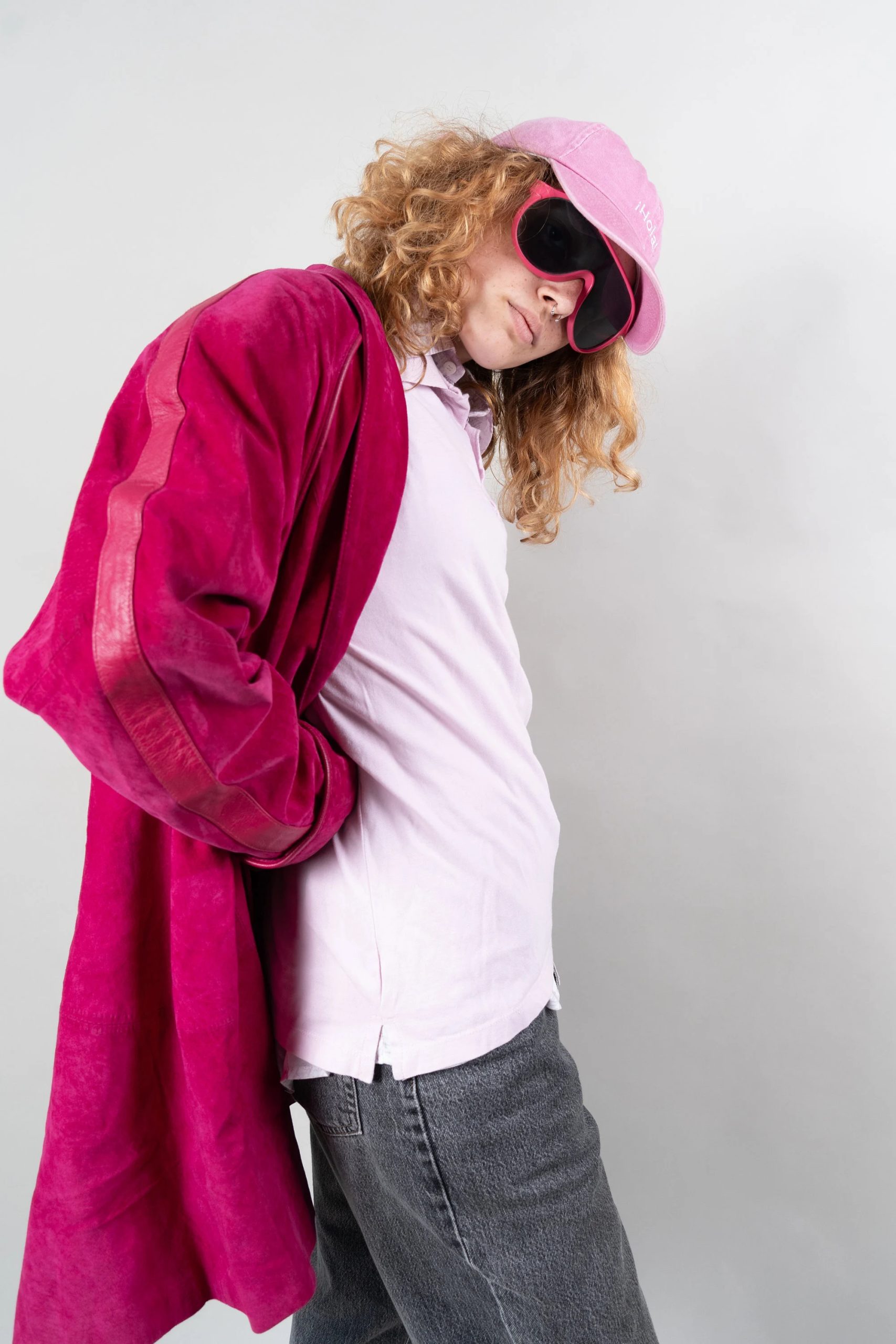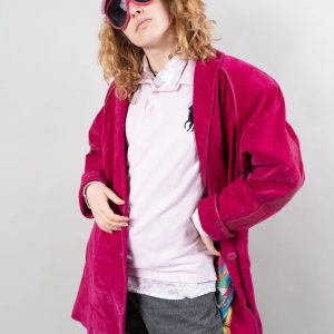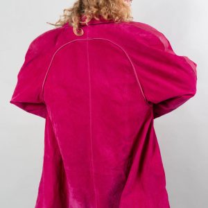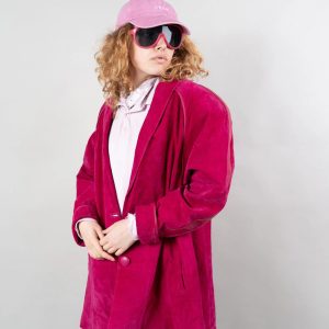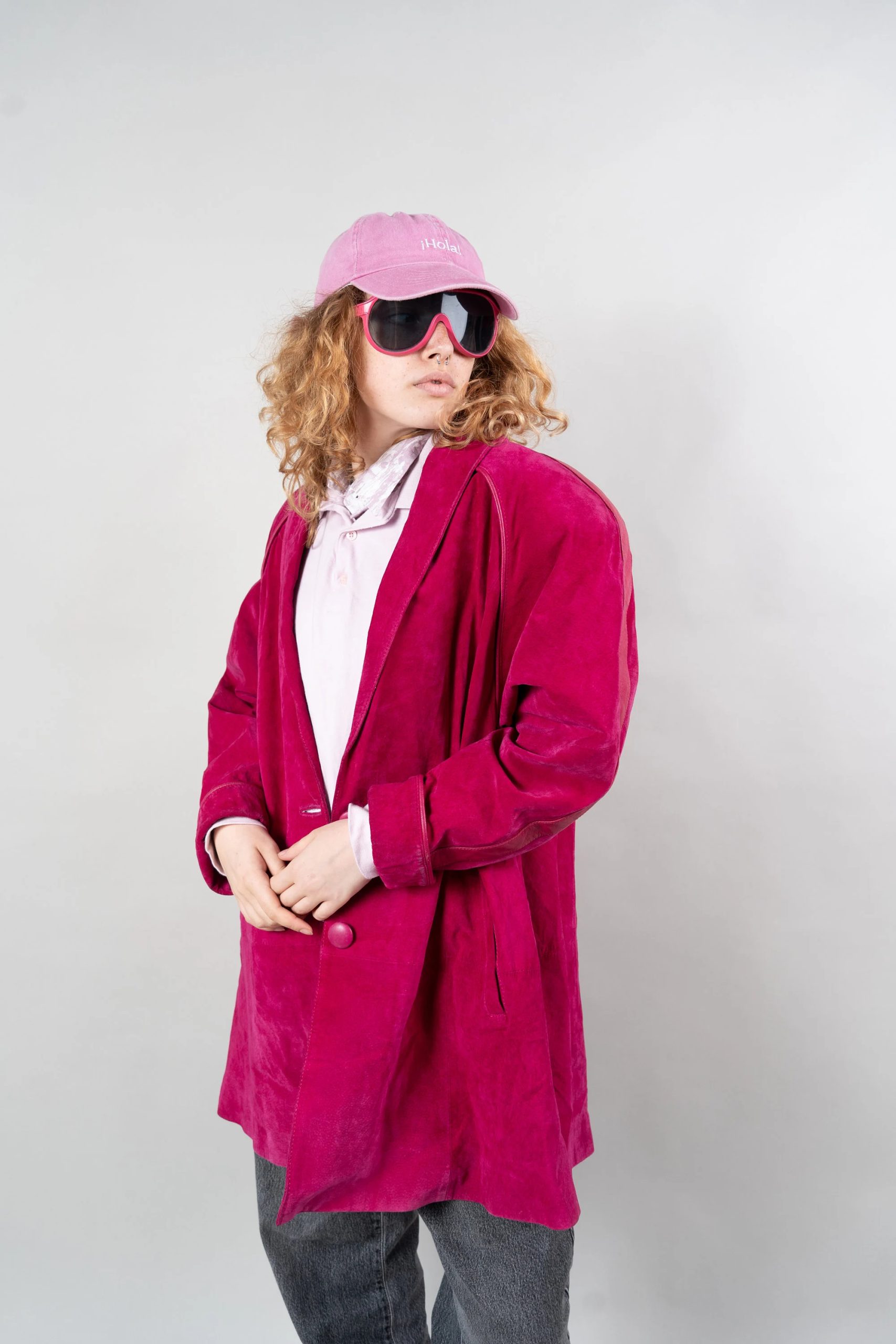 This magenta velvet blazer adds a touch of vibrant color and luxurious texture to your everyday look. The relaxed shoulder cut creates a flowing, elegant drape, while the soft cape collar and two oversized buttons exude a minimalist, modern style. The hip-length cut pairs easily with T-shirts, knitwear, or shirts; spacious hand pockets keep your essentials at bay. Combining style and comfort—pair it with trousers for an elegant look, or with jeans for an instant style boost.